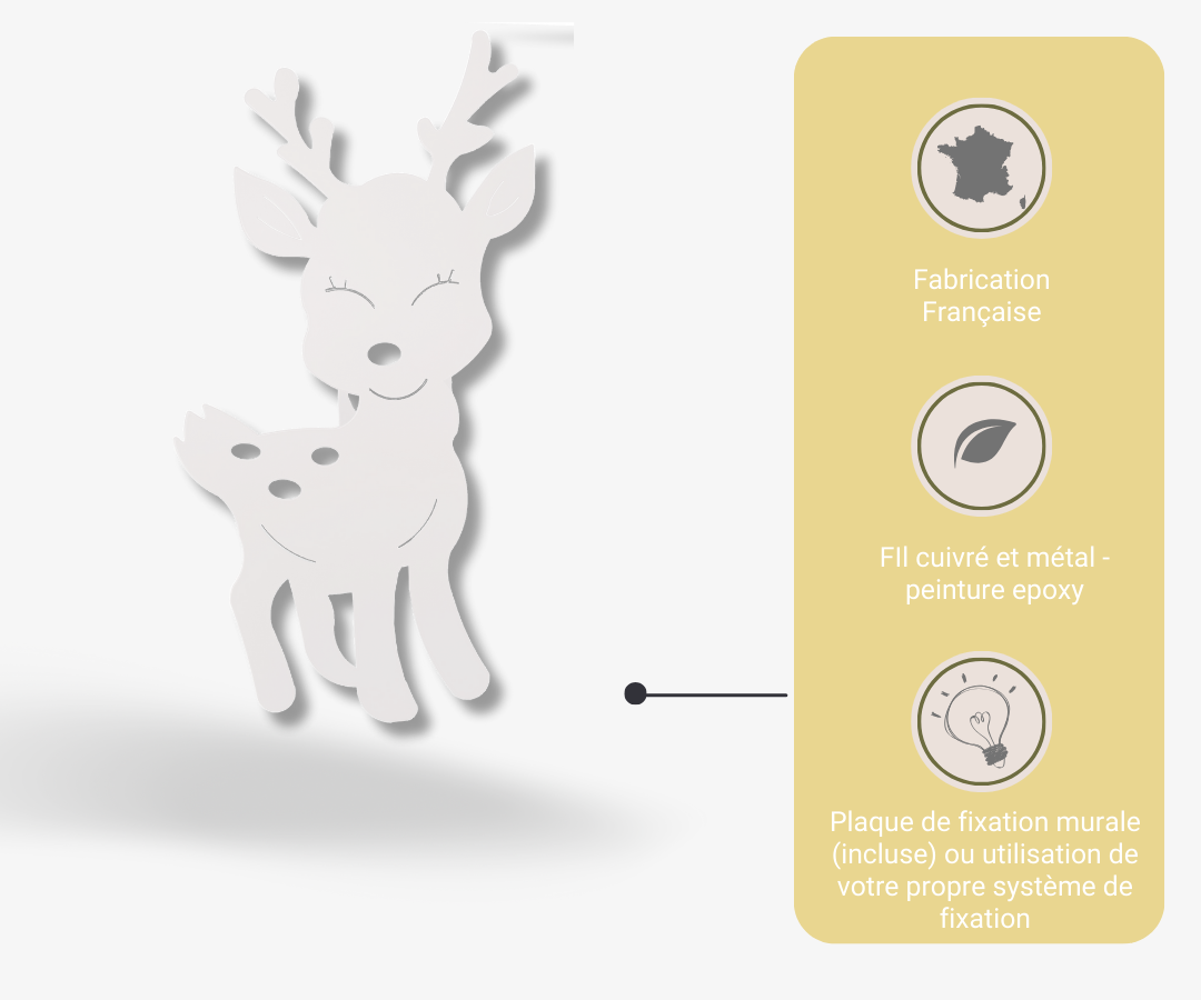 Elle possède une bague pour douille et ampoule E27. L'applique s'accroche grâce à notre plaque de fixation murale qui est à relier à l'applique grâce à une douille. Ce produit permet d'ajouter une touche déco à la chambre d'un enfant, mais peut aussi servir de veilleuse. Avec une hauteur idéale de 34 cm, ce luminaire offre un éclairage doux et réconfortant, créant une atmosphère apaisante.