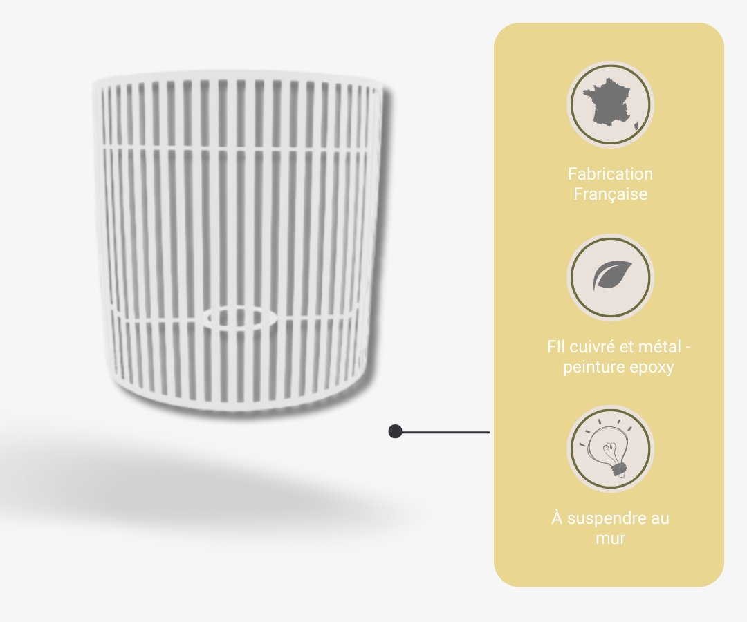 Le produit est imaginé et assemblé à la main, puis peint en noir et ce, toujours dans notre atelier bourguignon. C'est un mélange de technologie et de savoir-faire français. La plaque de fines lamelles de métal est découpée par un laser pour une qualité parfaite, puis est soudée sur une applique murale. Nous avons fait le choix de travailler avec une entreprise de proximité pour la découpe laser, située à environ 20 kms de notre atelier pour une empreinte carbone la plus faible possible et pour un travail de proximité. C'est au total 32 lamelles de 5 mm de large qui composent l'applique murale.