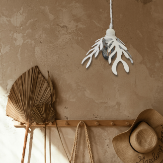 Il vous suffira juste d'insérer la douille de votre cordon de suspension dans la bague E27 de ce produit et d'y mettre l'ampoule de votre choix. L'écart des feuilles d'algues est modulable : vous pouvez agrandir ou rétrécir l'écart.